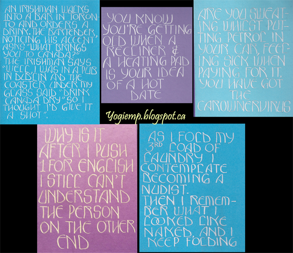 P2: You know you're getting old when a recliner and a heating pad is your idea of a hot date. P3: Are you sweating whilst putting petrol in your car, feeling sick when paying for it, you have got the carownervirus. P4: Why is it after I push 1 for English I still can't understand the person on the other end. P5: As I fold my 3rd load of laundry I contemplate becoming a nudist. Then I remember what I looked like naked, and keep folding. |