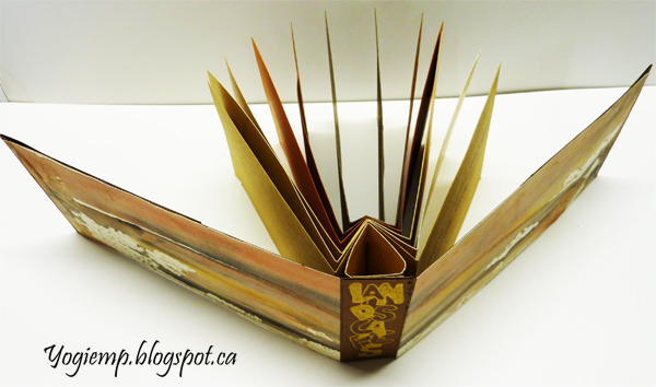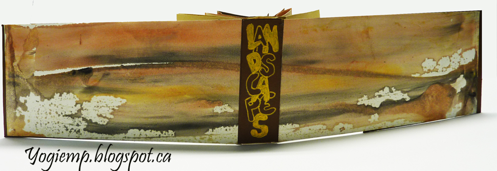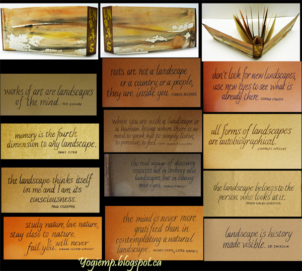 Sept 19, 2024 Our challenge for our October 8th meeting is to play with the One Sheet Folds #27 Spider Book from Hedi Kyle's "Art Of The Fold" book. Since our goal this year is to use what we have... I raided my off cut brownish papers... and a piece of a geli print I made which reminded me of a landscape and the rest evolved... landscape quotes added. I cut my papers to 3"h x 11"w and scored from the mid fold at 1/8" increments with the last score at approx 1". I added the geli print to the front and back covers but it was a little shy of the full length so have a little brown fore edge. Quotes written with a Zebra nib in a kind of Italic. Since it was easier to photograph rather than scan the pages, some of the text is a bit distorted... |