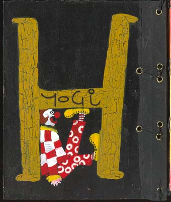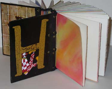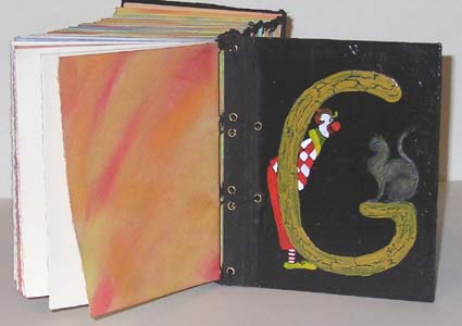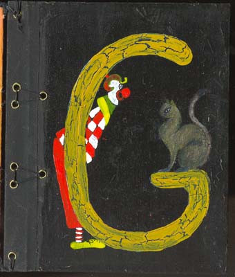 The inside covers are very whimsical. I have this weird, but beautiful wrapping paper that has clowns and other humorous things on it. I took the concept and and a bit of the clown idea and worked them into my initials. One on the front and one on the back inside covers. The letters themselves are crackled with a couple of layers of paint. |