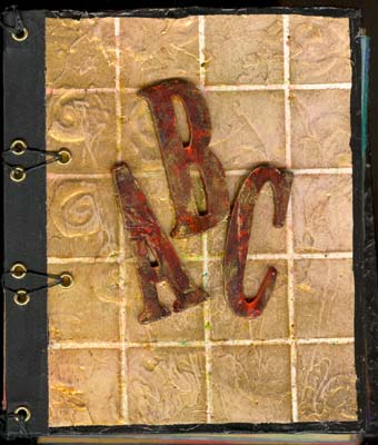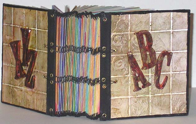 ID: ABC - XYZ Alphabet Book This is the results from a bunch of mistakes... These covers were originally made for an alphabet fat book swap (Oct 2006), but it wasn't until after I finished decorating the outside and inside of the covers, that I realized I had made them in portrait mode rather than landscape mode, so they were put to the side thinking one day... I was also making this book with an open spine concept, but that was the second mistake I made. I had put my tabs level to the top and bottom edges and only made very thin tabs. It really lacked strength and the position was off since I always make my pages slightly smaller than my covers. OK this needed rethinking. I cut out some book board the width of the tab and the height of the cover, then cut out a portion of the tab and a portion of the new inset piece and glued them together (splicing technique). Reinforced all this with some adhesive backed linen hinging tape. Painted it with black acrylic paint to match the covers. Voila, you'd never know the difference. Used my Crop-A-Dile to punch my holes and added long neck gold eyelets (available from Quietfire Design), they're indispensible. |