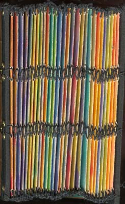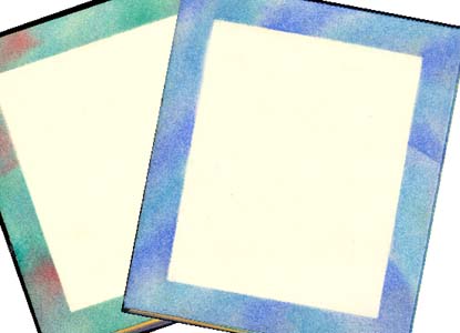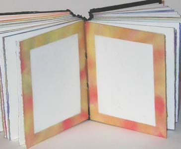 The Front of each spread is colored using Pan Pastels which I sprayed with Krylon workable fixative. It set the colors but is still erasable and can be worked on top. I used a rectangular piece of cardstock to create a frame on each cover page. the back of one spread and the front of the next match in color. I did many different combinations of colors. The very first and the last page are done as a full page rather than a frame. |