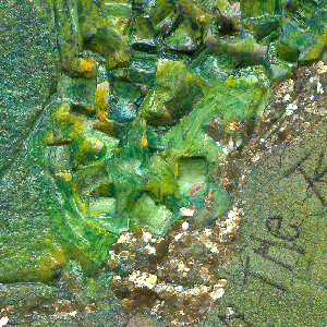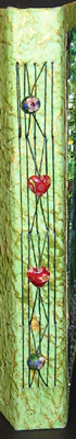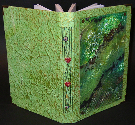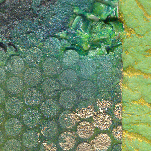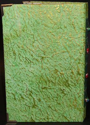 I used a lot of Golden products, Crackle Paste, Mica Flakes Gold fine, Molding Paste, various colors of Fluid Acrylics, then added some Liquitex Glass Beads & Gold Leaf. Also used Zutter waste, screening for texturing the molding paste and a palette knife. (see detail pics below) I used a heavily texture thick mulberry green paper to cover my bookboard. I first did a dry brush paint application to the paper because it was a bit garish on its own. I used Golden's fluid acrylics "Jenkins Green" & "Iridescent Gold" which caught on the high points.
