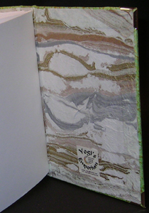 I did a totally hard cover structure using a decorative running stitch with bead accents using 4ply waxed linen thread for the signatures and a 2 ply to attach the beads both in a forest green color. The round beads are ornamental and the hearts are red glass with inclusions. The artwork is adhered with glue and then gold snap eyelets which add extra structure and detail. The corners are protected with gold book corners. The inside covers are covered with a gold/silver marbled Thai paper. Each of the 5 signatures has 10 pieces of 24# Neenah, Neutech 25% cotton Ultra White Wove Finish paper folded in half to make 40 pages per signature for a total of 200 writeable pages. This is a beautiful paper to work on, accepts inks with little to no bleeding. Great for calligraphy and journalling. |