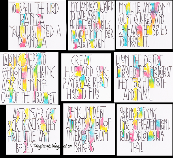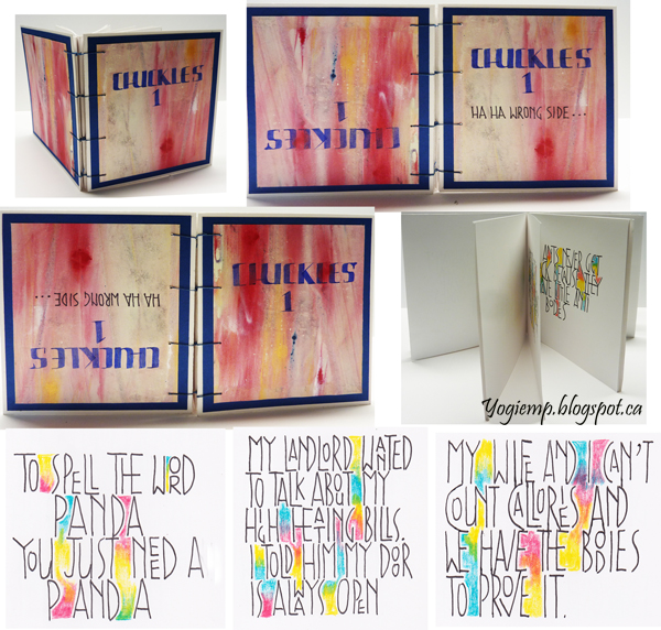 Created: November 23, 2023 I haven't done a coptic binding since 2010... but thought it would work for this project, but not as well as I thought. Definitely out of practice... It's 4 signatures of 3 or 4 folios with a total of 52 pages. I only wrote on the right side of each page. A friend sent me a bunch of funny sayings and I was in a mood to create a booklet of them. Another friend had just given me some wonderful 80# paper that had a slight glossy feel to it and I love writing on it... sorry don't know the exact name of it... Text written with a .08 Micron pen in a funky monoline style. I love interconnecting letters... then colored with Prisma colors #905, 917 & 926 |