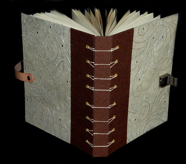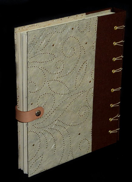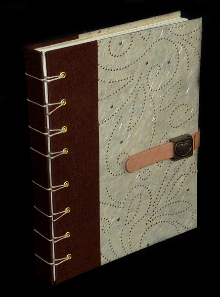 covered with a decorative beaded paper and book cloth. The book block is a running stitch with kettle stitch binding done in a 2 ply waxed line thread "Natural" and held to the covers with the criss cross binding (aka Secret Belgian Binding developed by Anne Goy from Belgium) done in a 4ply waxed linen thread "Natural/Oatmeal". I added gold eyelets in all the holes. The signatures are created with LBS End Sheet paper from Columbia Mills. The inside of the covers is done with a matching mulberry paper. There are 9 signatures of 4 folios (16 pages per signature or total of 144 pages). I've attached a leather "Perfect Closure" by Zutter. My logo will be on the inside back cover |