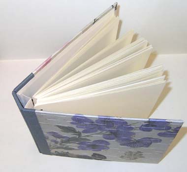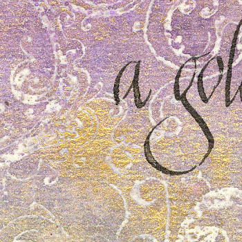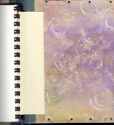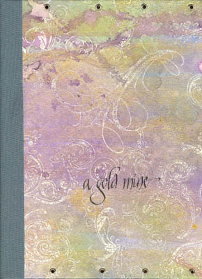 To create a journal like this one with just a basic scrap book paper covering or other plain type paper the cost would be approx $45.00 To create one with the labour intensive decorated paper would be in the range of $100.00 plus I needed another journal and was trying out one of Julia Andrus's techniques from her Paper Transformed book "Radiant Batik" which resulted in the cover paper for this journal. You can find the Nitty Gritty details for this background by clicking here.The covers and spine are made from book board. The spine is covered with a grey book cloth and the covers with the decorated Arches Text wove paper. There are 80 sheets (160 pages) of Domtar Genoa Bond white paper. The holes are punched with a comb binder and bound with a Zip Lock coil, so I can open, close, add more or remove pages if I want. The journal is held onto the cover with Stonehenge pages that insert into an envelope style binding on the inside covers. So the whole journal is removable and can be replaced with a new one when this one's full. I reinforced the envelope section with the long neck silver eyelets which also add a decorative detail to the covers. I wrote in my journal name "a gold mine" with Moon Palace Sumi Ink and a Mitchel #4 nib in a loose Italic style. |
