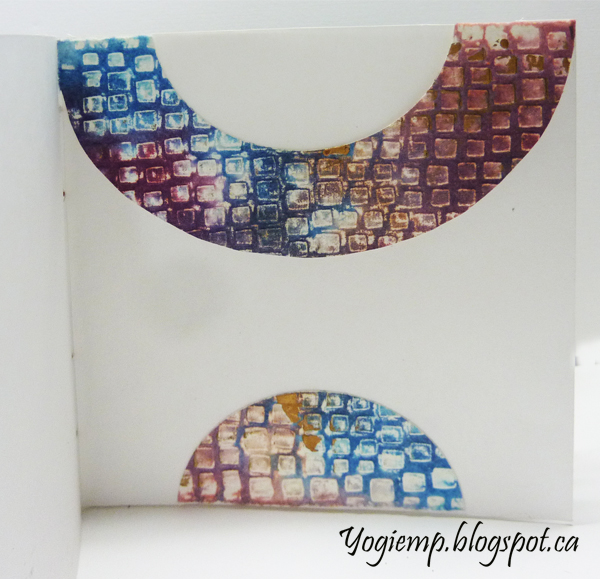 another circular cut out pocket. Dry embossed cardstock adhered to cut out and drop out piece adhered at bottom. |