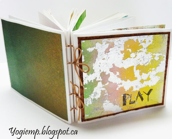 I used an unknown heavy weight white paper 9" x 12" and cut it in half. Each page folded into 3 equal sections of 4". Pages open up to 2 to 4 section widths. Some with pockets. Front decorated with a silver gilded, spray web, Distress pad background. The word "Play" written in Funky Neuland with a Parallel pen and Sumi ink. Back page is spray painted with Krylo spray paints. BINDING: Thread 2 needles to one piece of thread approx 14" for this booklet. Starting with the back section (working back to front), insert the needles from the inside into the 1st 2 holes from the top (one needle in each hole). Repeat with next 2 threaded needles in bottom holes. Insert needles into next signature then put the 2nd needle into the 1st hole in this signature, and the 1st needle into the 2nd hole. Pull snug. Work on the bottom 2 holes at the same time. Put the needles directly above in the next signature. and repeat the cross over of needles to the outside. Tie knots when in the final signature and cut remaining thread. |