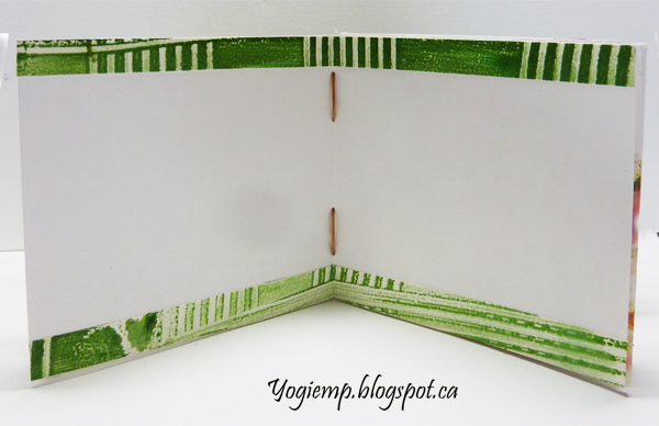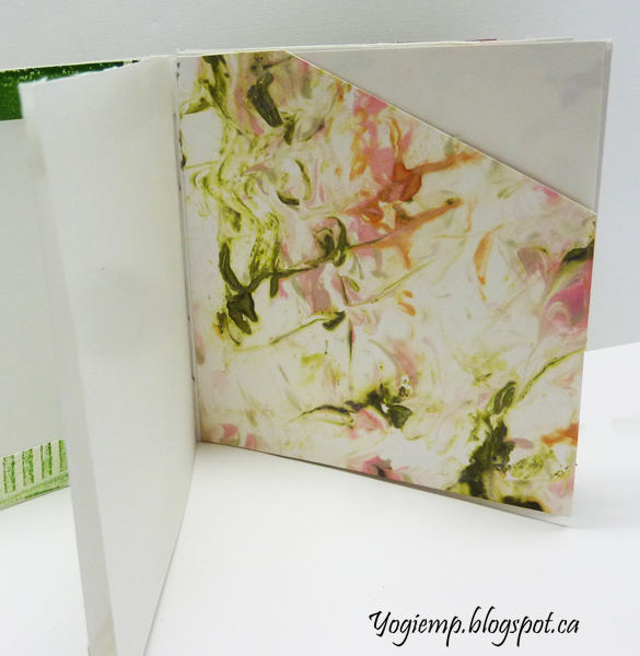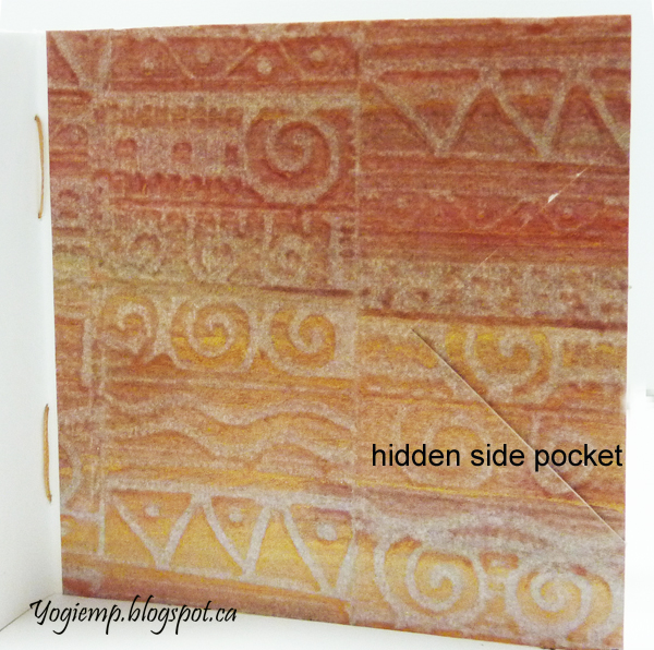 A side pocket with a triangle cut out. Paste paper decorated paper and Rollagraph stamped on misc paper. Drop out piece adhered to floor of pocket. |