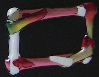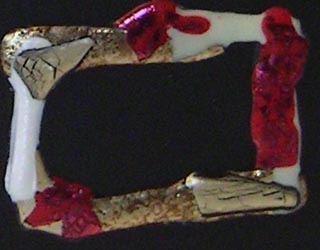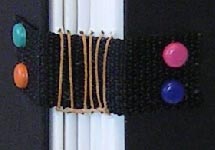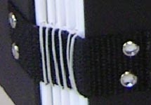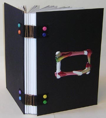 taught a class on how to make this journal. It consists of 6 signatures of 6 pieces of paper/cardstock (8.5 x 11") folded in half to make a 5.35 x 8.5 page size after trimming. Each signature contains, 1 Synergy Bond 25% cotton, 1 white or cream cardstock, 1 Synergy Bond, 1 Full Spectrum black cardstock, 1 synergy Bond, 1 Canson 90# CP watercolor paper. The covers are two pieces of mat board sandwiched together for durability and to hide the backs of the brads holding down the spine bands. They have been colored along their edges to match the mat board. The ID of each journal is the color of the outer mat board and the inner mat board. The spine bands are a thick durable nylon webbing, similar to what's used on fanny packs. Each journal has a coordinating colored 4 ply waxed linen thread used for sewing. The brads are one one, multi colored, on another faux rhinestones and on the last red brads. The frames on the covers are made from Friendly plastic. |