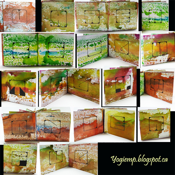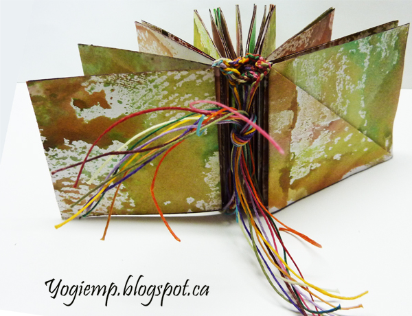 I geli plated a bunch of pages from my Fabriano 1264 Mixed Media 110# paper pad using Dr. Martin's Tech Drawing ink. Cut them to 3"h x 12w. Folded in half and half again creating pockets with some of the folds. Added the words "U Are Absolutely Wonderful" using my favorite Art Nouveau style of lettering. Not sure what I'll put in the pockets... Time will tell. Bound it with every color of 4ply waxed linen thread I have... I'm not that happy with the knotting I did. Her explanation wasn't very clear. |