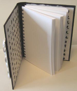The journal pages are attached to a black Stonehenge cardstock which is attached to the covers. I found the black Stonehenge was discoloring my first pages, which is why I added the Asian script heavy rice paper. |