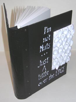The words written on the cover "I'm not nuts +++ Just a little over the edge" was done with a Mitchel 5.5 nib and Bleed Proof white ink mixed with some water in a funky, little crazy, type of lettering. The nut piece hangs slightly over the edge of the cover. |