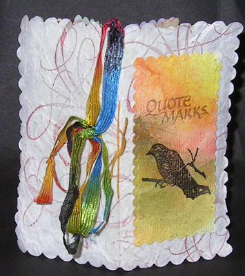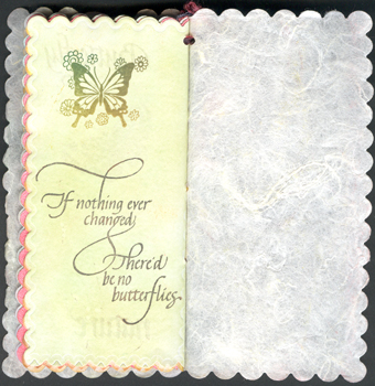 Colored the paper with Green Tints. Rubber stamped the QF quote with "Olympia Green" and the butterfly (Faerie Song "Floral Butterfly") with Adirondack "Autumn Sunset". I then put all the pages together and did a simple pamphlet stitch binding with 4 ply waxed linen thread "Autumn Yellow". I punched a 1/8" hole to run my rainbow ribbon through as a tie to hang the book from. |