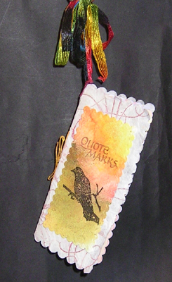 I rubber stamped the large QF Flourish all over the cover with "Crimson Red". I die cut a 4.25"h rectangle from some decorated paper I had made a while ago. Rubber stamped the QF Raven with "Black Onyx" and the "Quote Marks" with "Vintage Sepia" |