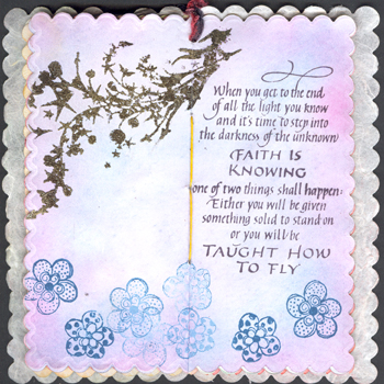 Page 8 & 9 Colored the paper with Red Tint & Blue. Rubber stamped the QF quote with "Imperial Purple". Rubber stamped the butterfly (Inkadinkado "Fluid Motion" set) with Color Box Multi pack in the Pinks to Blue tones. Added various colors of Stickles (red, gold, copper, blue and green) in the dots of the trail. |