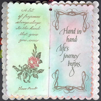 Colored the paper with Green & a Blue Green. Page 12: Rubber stamped the QF quote with "Crimson Red". The Rose (Stubby Stampers #2735) with "Olympia Green", "Vintage Sepia" & "Satin Red". Page 13: Rubber stamped the QF quote with Olympia Green. The QF Flourishes (this is from the new Xmas/09 Plate 28 set) with :Vintage Sepia" merging two flourish corners together. |