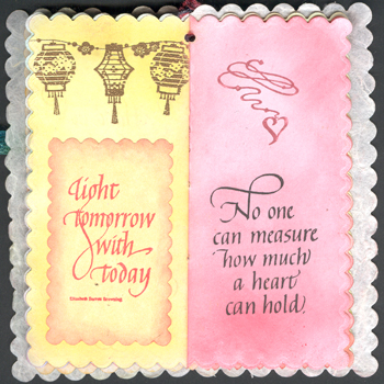 Colored the papers with Yellows on the left side and Red on the right side. Page 14: Die cut the rectangle from the 4.25"h die making it narrower and shorter than the die. Coloring the edges with the Red. Rubber stamped the QF quote with "Satin Red". Rubber stamped the Lanterns (Inkadinkado "Asian by Design" #98626 set) with the Satin Red and embossed with Queen's Gold. Page 15: Rubber stamped the QF quote with "Black Onyx" and the QF Heart with "Crimson Red". |