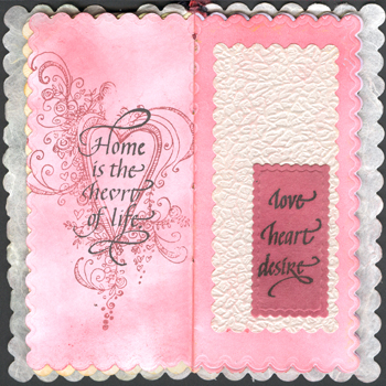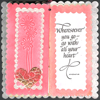 Colored the papers with Red. Page 6: Rubber stamped the Flourish Heart (Old Island #693G) with Crimson Red and the QF quote with "Black Onyx". Page 7: Die cut the textured white pearlized paper with the 4.25"h rectangle and made it narrower than the die. Die cut the small rectangle with the 2.25"h die from some red mulberry paper I had in my stash. Rubber stamped the QF sentiment words with "Black Onyx" |