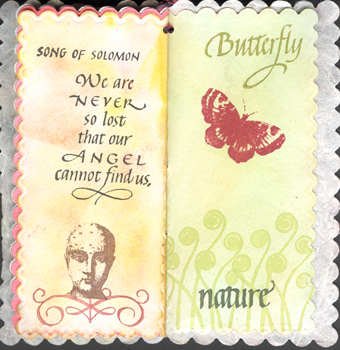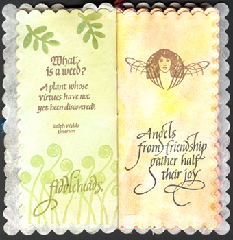 Left page is colored with the Green Tints and the right side with Yellows & some Reddish Brown. Page 2: Rubber stamped the QF "Fiddleheads" with Versa Magic "Tea Leaves". The QF quote with "Vintage Sepia" and the word "Fiddleheads" with "Spanish Moss". Punched out some Fern Fronds (EK Success) from colored copy paper. Page 3: The QF Head & Flourish to mimic an angel with "Vintage Sepia" and the QF quote with "Black Onyx" |