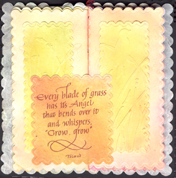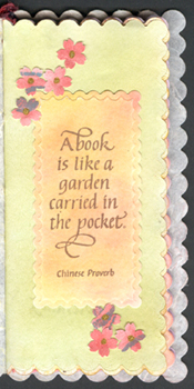 Colored the paper with Green Tints. Die cut the 3.25"h rectangle and rubber stamped the QF quote with "Vintage Sepia". Punched out some small Sakura Flowers (Carl Craft) from some previously decorated paper and added a touch of gold Stickles |