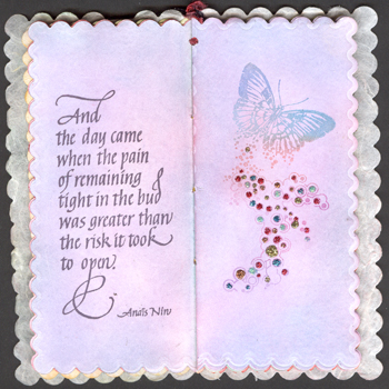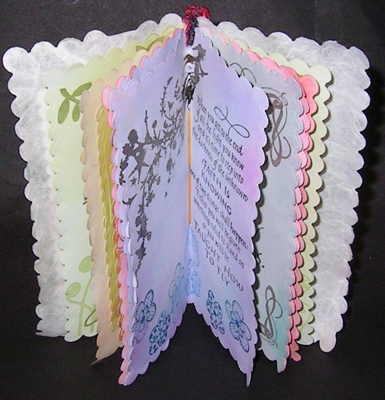 or decor or whenever. I also wanted to make a booklet using my rectangle Nestabilities, and this little booklet was created exclusively with the "Long Classic Scalloped Rectangle" set. I used Xerox Premium Inkjet 24# White paper. Cut a sheet in half and folded them, put them in the 4.25"h die, making sure my fold was just shy of the other cutting edge. I embossed them as well, one folded page at a time. I cut 6 folded pages. The cover was done using the 6.25"h die, and a medium thick white heavy textured mulberry paper. Again I made sure the folded edge was shy of the other cutting edge. I also put it in the die again to get the height I wanted, making sure the scallops matched so I wouldn't get any distorted corners. Most stamps used are from Quietfire Design which will be referenced from now on as QF and the stamp pad ink is Versafine unless otherwise mentioned. All pages were colored with Pan Pastels in various shades. |