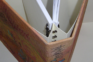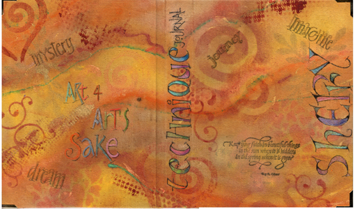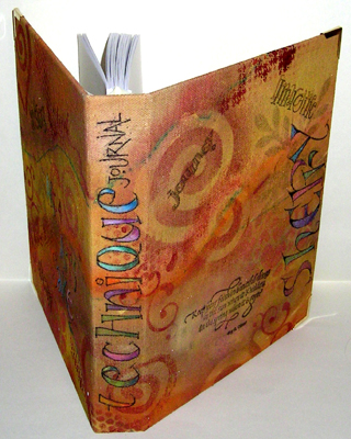 inside. The covers are book board covered with a hand painted/decorated unprimed canvas (technique learnt in Christine Ahmad's class recently). Used lots of acrylic paints, rubber stamps (Quietfire Design quote, Roann Mathias word stamps, foam & hand made stamps), stencils, Prisma colored pencils, Super Metallic Ferby's, and probably a few other things I can't remember. |