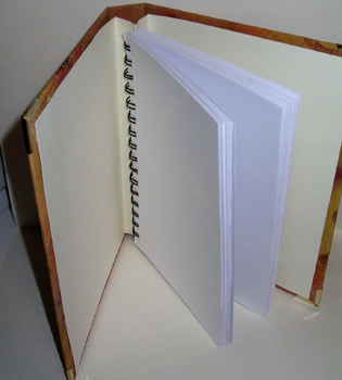 I used white Stonehenge cardstock for the inside cover that attaches to the book covers. The pages Sherry supplied and I believe are copy paper. I attached 3.4 of the Stonehenge cover to the back of the journal cover, leaving about a1/4 free for a bit of movement when handling the journal. |