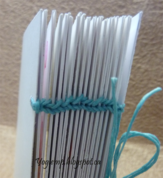 I used Strathmore Series 300Bristol Vellum surface paper adhering 2 pages together - back to back. Added the cover - Staples 110# white cardstock, gluing 2 pieces together and binding with a 4ply Turquoise waxed line thread. I punched my holes 1/4" from the edge and used approx 2" of thread for each page plus covers.