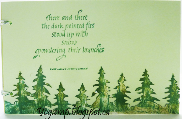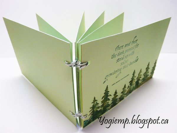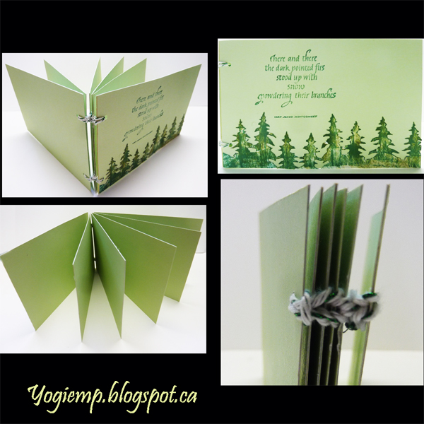 Created: July 21, 2022 It's extremely versatile if you have single page binding needs. Will also work with Signatures but you wont see as much of the stitching detail. It does need heavy cardstock or cardboard pages rather than text weight paper. The binding will probably rip the binding holes... Created this booklet to test some string I may use in a class coming soon. It's basically a thin green/white string. I'm not as happy with it as I am with the butcher string from the previous booklet. I used a double side scrapbook paper (liked the green side - hated the other side...). Die cut using Tim's "Tree Line" die. Sponged Distress "Forest Moss" and then with a bit of "Pine Needle" Adhered to cover and rubber stamped the saying (Quietfire Design). Punched 1/8" holes with a Crop-A-Dial (all in one shot...) This booklet has 5 framed pages.