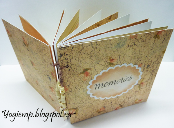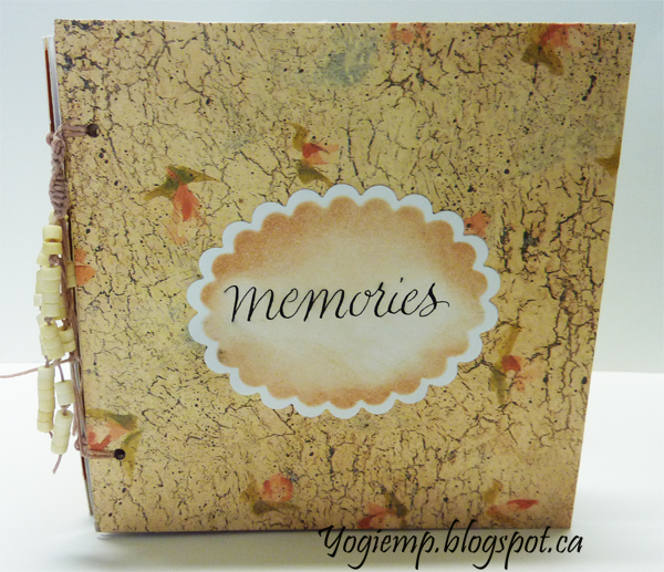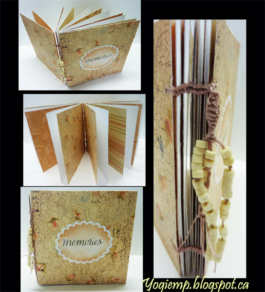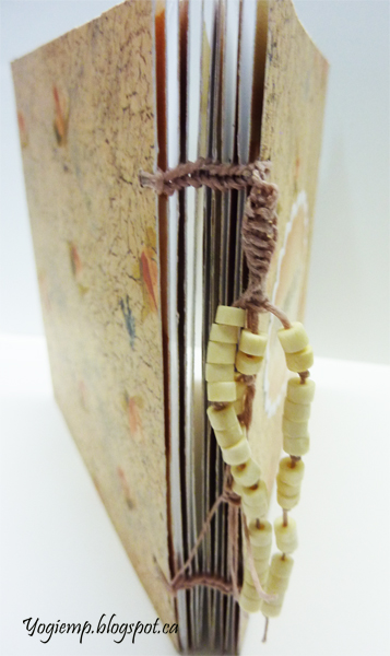 I raided my scrapbook papers to find a nice blend of designs/colors. There are 10 pages plus the covers. I adhered 2 scrapbook papers to the covers for strength and a heavier feel. I placed the design portion of the paper facing each other to give a wide spread leaving the backs which are white for whatever. On the white sides I added another narrow piece of white paper to give the strength for the holes for binding. Each hole is individually bound with a 4ply dusty Rose waxed linen thread folded in half. The 2 ends inserted into the hole from the inside and then threaded through the loop to create your 1st slip knot. Ends inserted through the inside of the next page hole and threaded through the loop created. Continue to the end and tie a double knot. I punched my holes 1/4" from the edge and used approx 2.5" of thread for each page plus covers and a bit more to string the beads (from a necklace). I added a bit of a twisted macramé stitch