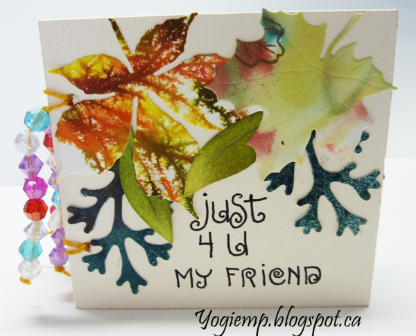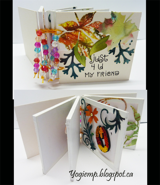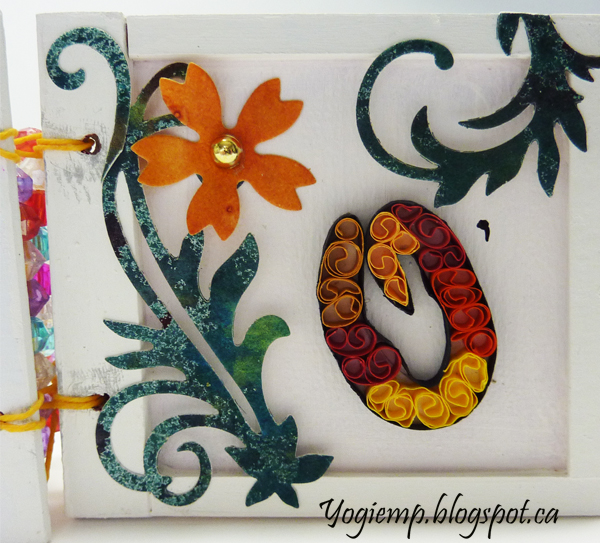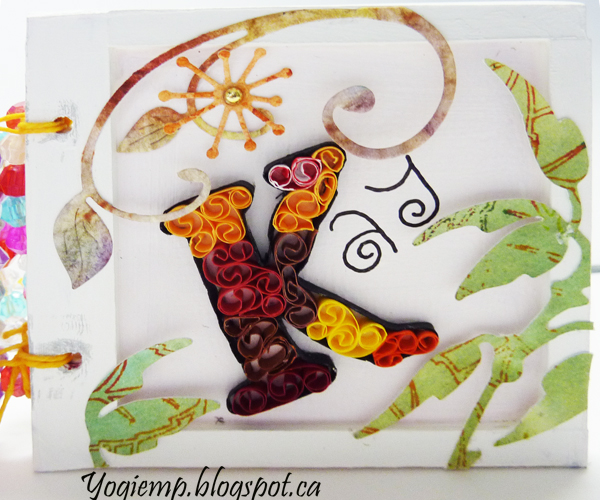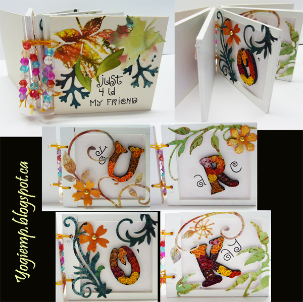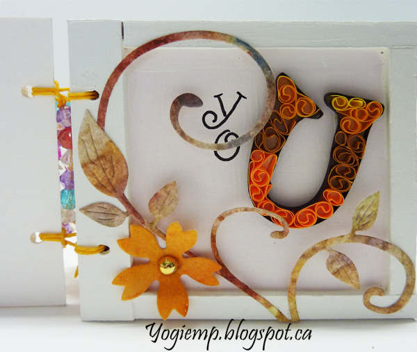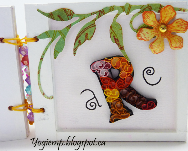 I used, mat board (red - I had lots of end pieces...) for my pages and to build my frames. Since I didn't have dies that cut squares through this thickness I had to cut all by hand...When each page was assembled I painted it with white acrylic paint. Used my Crop-A-Dial to punch the holes. Bound it with a yellow 4ply waxed linen thread. On the left over thread I hung a bunch of beads. Adhered my quilled letters on each page and wrote out the rest of each word with a .08 Micron pen in a Curlz lettering style. Raided my stashes of leaves, flowers and stuff and adhered to each page. The quilled letter on each page spell U Rok. With the added calligraphed letters it says "You Are O'Kay" |