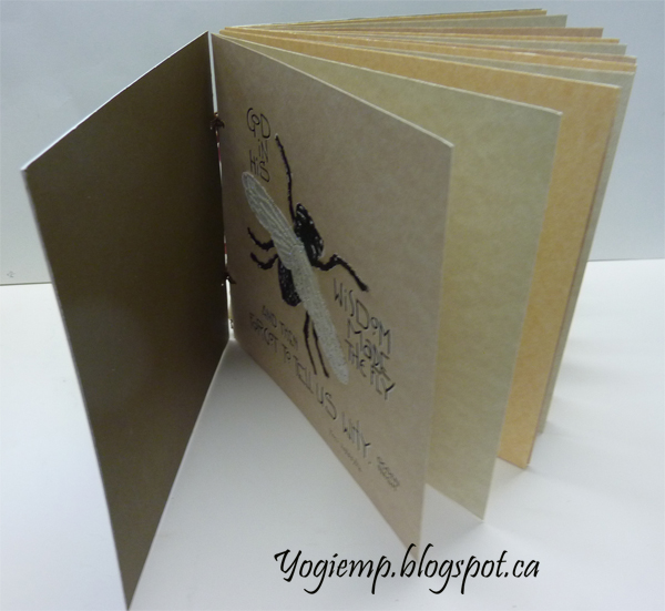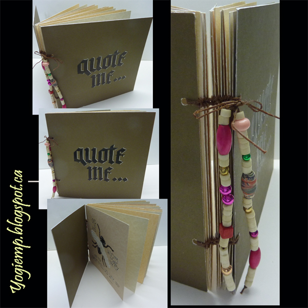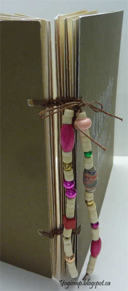 I used parchment scrapbook papers in various tones. The cover is thinner scrapbook paper so I doubled it up and adhered 2 pieces together. Each hole is individually bound with a 4ply brown waxed linen thread folded in half. The 2 ends inserted into the hole from the inside and then threaded through the loop to create your 1st slip knot. Ends inserted through the inside of the next page hole and threaded through the loop created. Continue to the end and tie a double knot. I punched my holes 1/4" from the edge and used approx 2" of thread for each page plus covers and a bit more to string the beads (hand made bead as well as beads from a necklace I broke apart...).