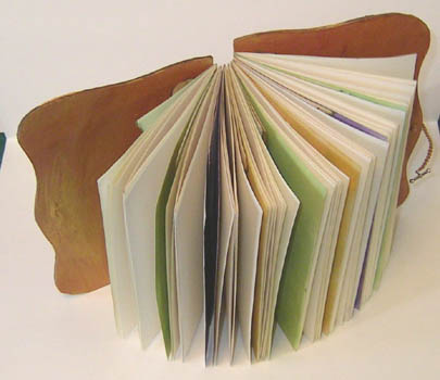 All the off set cover sheets were done with yellows, red and a touch of green and designs erasered onto the page then fixed with Krylon workable fixative, then the edge torn and distressed with Distress stamp pads in a brownish tone. The first sheet from each signature was decorated with various colors of Pan pastels either in Greens, Purples or Golds with each facing signature having the same color scheme. The inside covers were painted with Daniel Smith Gesso's Venetian Red & Gold mixed and blended while wet. I used faux Rhinestone brads as a decorative element and to add strength to hold the hinges (which were also glued in place) and the brad ends are covered on the inside with a matching strip of paper. The ring portion of the book closure is held with wire and imbedded into the cover, then painted. You can also see the knot of the macrame closure cord on the back cover which is reinforced with some glue. The closure is done with 4 ply waxed linen thread and double half hitches. |