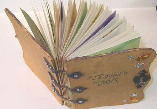The covers are made from book board and cut with a wavy edge. The outside is painted with Distress Crackle paint :Spiced Marmalade" and then rubbed with various stamp pads, color rubbed into and off with a cloth until I got the color I wanted. Added some faux Rhinestone gems in amber and clear. Wrote in the words "Treasure Trove" with a Zig marker. Added the Grungeboard lock which was colored the same way I colored the Grungeboard hinges. Versafine stamp pads in Vintage Sepia, Smoky Grey & Onyx Black, then with Brilliance Gold stamp pad to give it luster. |