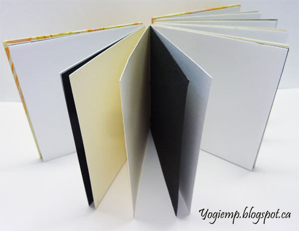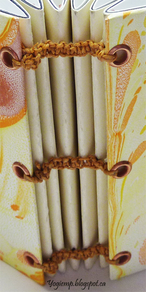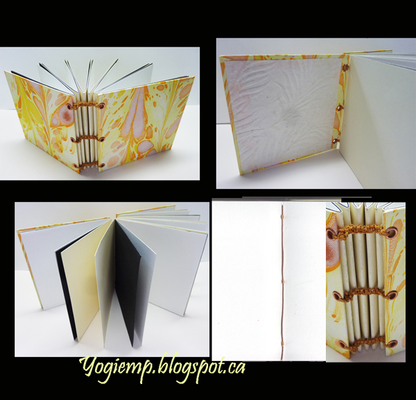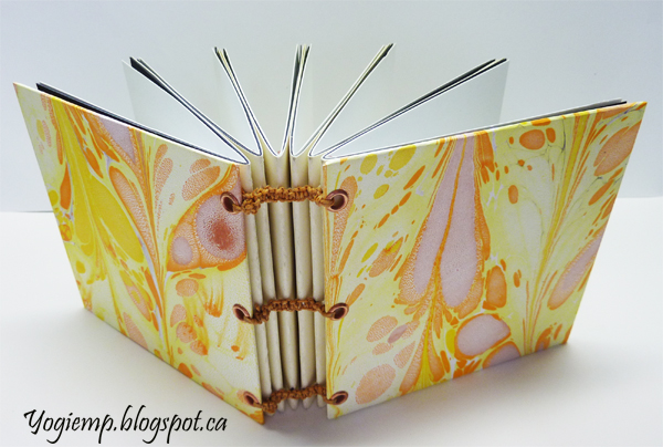 hand marbled paper in tones of yellow. The 6 signatures are Stonehenge paper (cream, black & white). 4ply waxed linen thread (butterscotch) wrapped around copper 18gauge wire running down the center of each signature, several square knots tied between signatures. There are 6 signatures of 3 folios (12 pages per signature or total of 72 pages). My logo will be on the inside back cover |