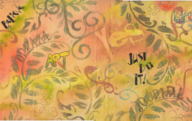 naturally it extends to making covers for my hand bound books. Used lots of acrylic paints, rubber stamps (alphabets), foam & hand made stamps, stencils (Tim Holtz & others), Prisma colored pencils, Some Sumi Ink with a Parallel Pen (did bleed on the canvas, but I have no objection to that), and probably a few other things I can't remember. |