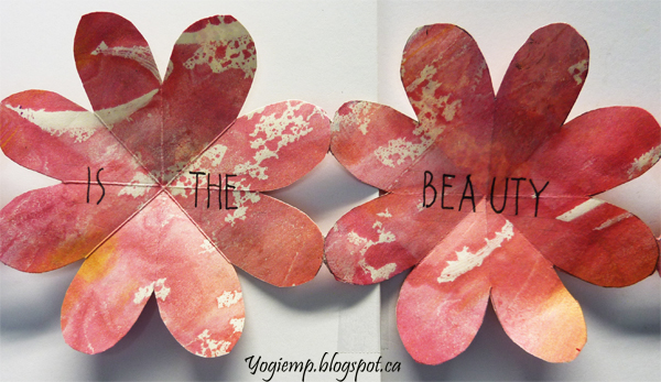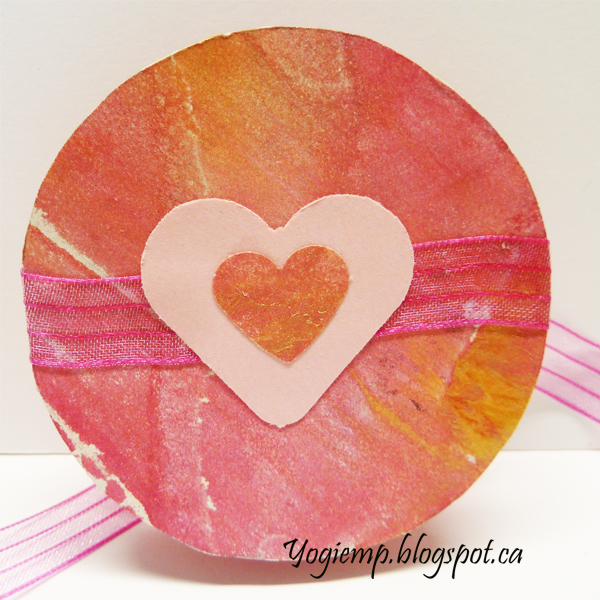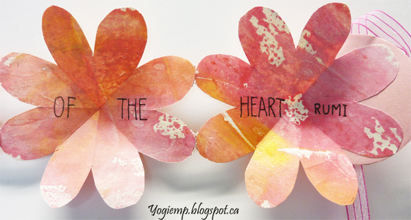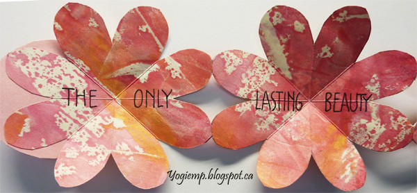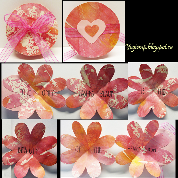 Heart Created: April 29, 2025 size: 2.5"dia x 1/2" thk. I made this for what I hope will be our June challenge which hasn't been decided yet... I created a template from 1/2 a heart, to get both sides the same shape and size to create my 4 heart master template (important) then cut out a bunch of them from a red toned geli print paper done on Columbia Mills End Paper. Folded all my flower cut outs. I then added a little scrap piece to the point edges of 2 flower shapes. Added the text - one word on each flower. Created circular covers from the same geli print glued to 110lb white cardstock and then to a piece of pink cardstock for added strength. Adhered a piece of ribbon to the back outside cover and added 2 punched out hearts words: The only lasting beauty is the beauty of the heart. Rumi |