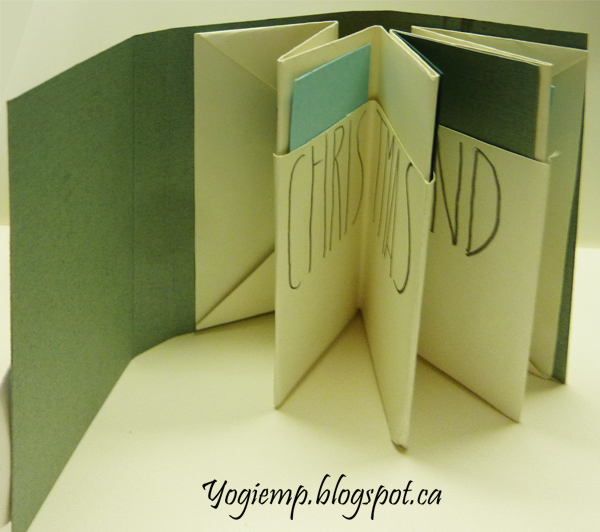 Christmas That little black thing embellished with mini hearts has a paperclip stuck between two pieces of cardstock to hold the cover closed. so cute... Each pocket will hold a cute tag. I wrote Merry Christmas to you and yours on the bottom section of the pockets. Original design: Paper cut to 9 x 12". Measure 4" point and create a 45º fold on each corner. Fold paper in 1/2, 1/2 again and so on till you have 8 folds. Can't remember the exact size for the pocket fold ups... but mine are 2.5" top and bottom. Glue each end to the cover flaps starting with the end flap. Cover: measure width of booklet and score, thickness of booklet and score, width of booklet and score, spine and score and width and cut off remaining cardstock. Cut 2 pieces of cardstock (same size) apply glue to both pieces and adhere to the other placing a paper clip between the sandwich (large part of paper clip to the outside).