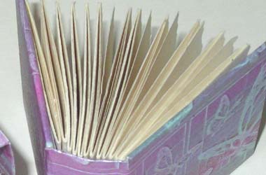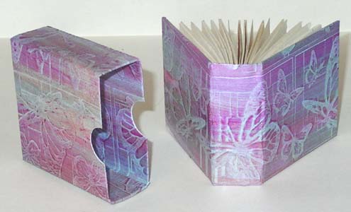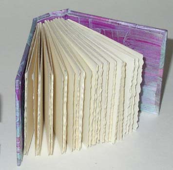 Top and bottom of each page is straight cut and the fore edge is cut with a deckle rotary blade. The book opens flat for easy writing. Pages are made from cream toned LBS end sheet paper from Columbia Mills. It's a heavy weight paper and works well with pencil, colored pencils & markers and many inks although not good with very liquid ink. There are 12 signatures of 3 sheets folded in half (12 pages per signature), with a total of 144 pages in the book. Each page is 2" square. I used a 2 ply cream toned waxed linen thread for binding. |