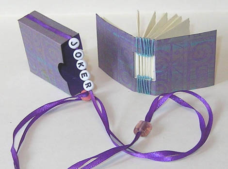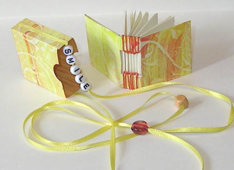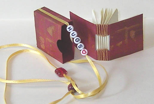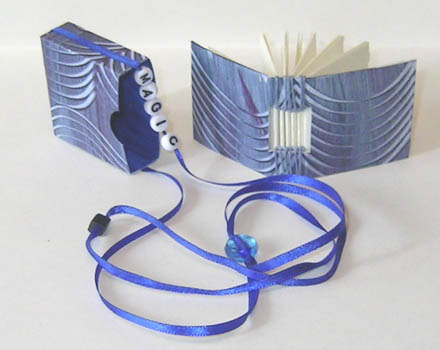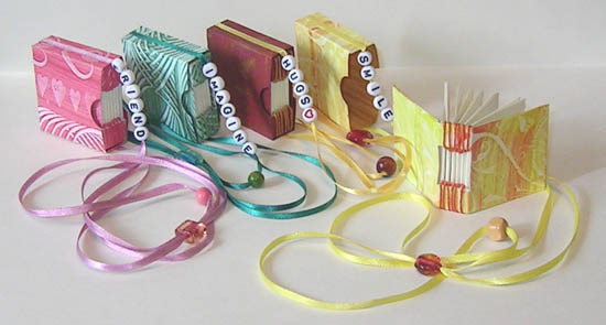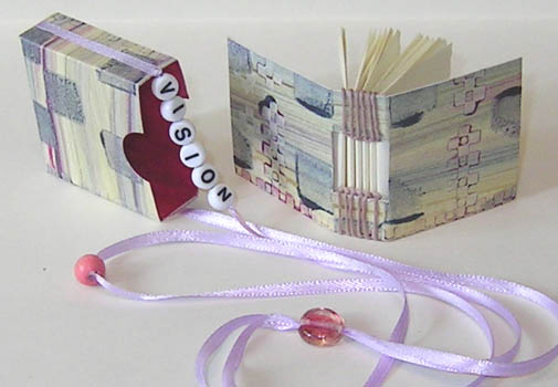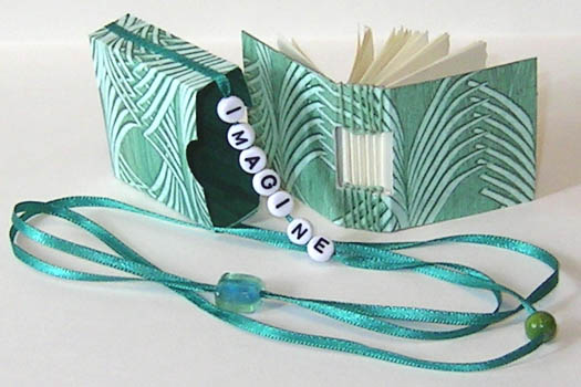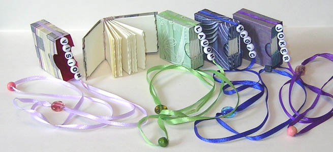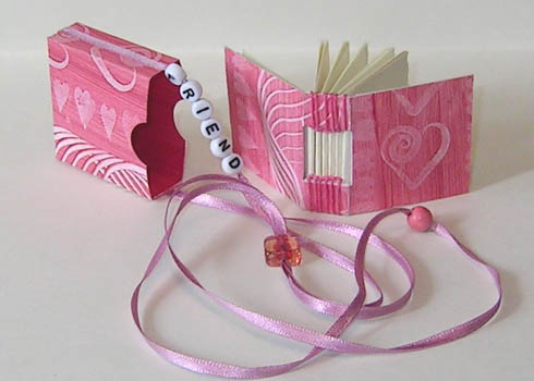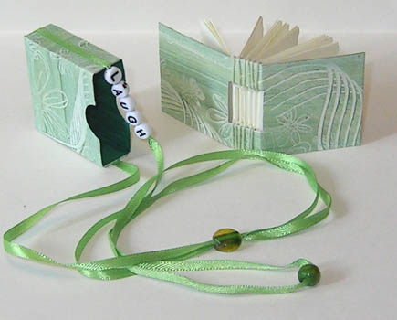 watercolor. There are 6 signatures of 4 sheets folded in half (16 pages per signature) for a total of 96 pages per booklet. Page sizes are 1.5" x 1.5" with top and bottom of page cut and foredge cut with a deckle rotary blade. The area where the 4 ply waxed linen thread wraps around the spine at the top and bottom is reinforced with a piece of mat board for strength and durability. Each cover is folded and glued to the inside. The boxes are painted on the inside for a finished look. The ribbon is glued to three sides of the box and letter beads are added to the ribbon to spell out a word. A glass bead is added as an adjuster for necklace length. The knot to tie the two ribbon ends is hidden inside a bead and glued in place. |