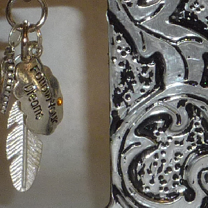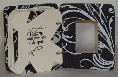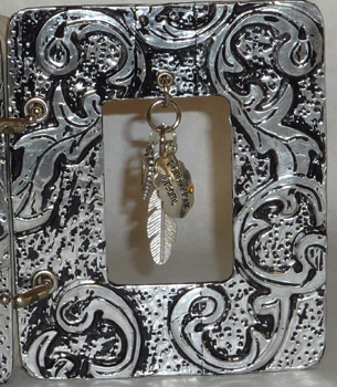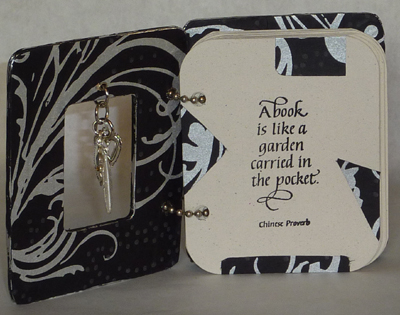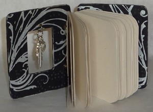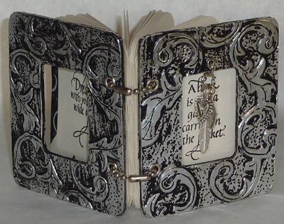 On the inside covers I used a beautiful black/silver paper. I put my paper down and used the cover as a template to get the exact size, so my paper would cover edge to edge. The window insert that dropped out, I used to decorate the front and back pages. Marked where my window falls, and rubber stamped the quotes (both from Quietfire Design) with Versafine Black Onyx, and clear embossed them. Put silver eyelets in the holes. Threaded my chain through the pages and covers. Punched a small hole to hang my charms, putting a long neck 1/8" silver eyelet. |