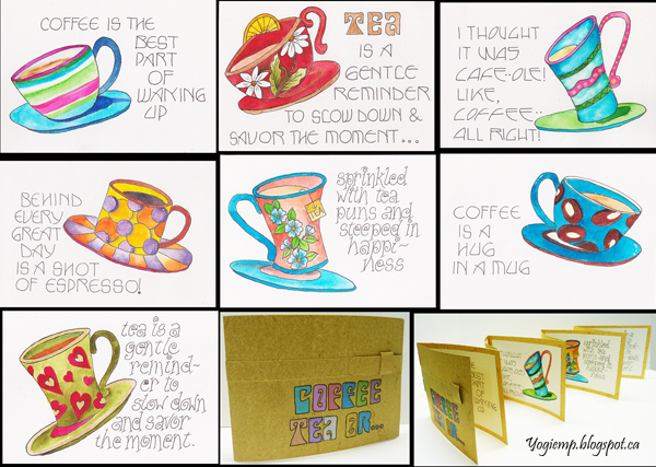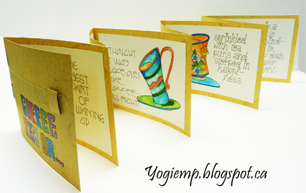 Booklet I used a beige heavy weight Elephant Hide paper which creases and folds fabulously. Artwork done on Canson Mixed Media paper using a Juice Up pen for outlining and Peerless watercolors. The cover is part of the 44" folded over. The title colored with Gelly Roll Metallic pens in every color... The closure is a 1/2" strip of the same paper adhered to the front only and a small loop to hold it closed. |