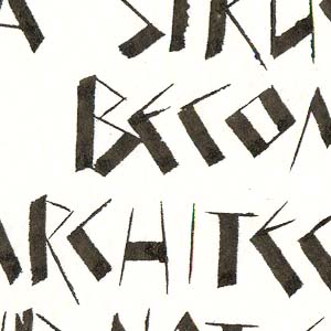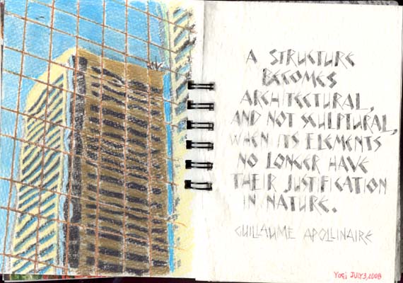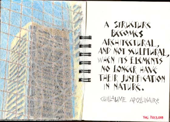ID : Sandra's Journal "Architectures"closed: 5"w x 7"h Created: July 3, 2008 I searched the web for quotes and thought this one and the one on my sign in page - apropos for her theme. I was looking at a friend's blog (Lorraine Douglas) and fell in love with one of her lettering styles she used on a piece called "Seekers". It's a take on Neuland but with a funky twist. I really li9ke Neuland style lettering, except some of the letters appear very bulky and not flowing enough for me. With the thin and thick lines, it was perfect. I wrote the quote using a 2.4 parallel pen and Moon Palace Sumi ink. Quote: a structure becomes architectural, and not sculptural, when its elements no longer have their justification in nature. Guillaume Apollinaire The quote I put in the sign in page (not shown) is: Architect: One who drafts a plan of your house, and plans a draft of your money. Ambrose Bierce