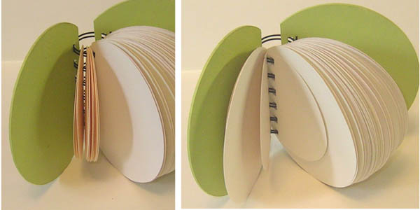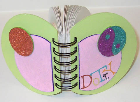 The covers are made from mat board and both inside and outside are painted with acrylic paint in a lime green color as well as the edge. The medium circles are painted with Distress crackle paint "Worn Lipstick" and then rubbed with various stamp pads to get the color I wanted. The edges painted with a Zig purple marker. The small circle in front was done with Ritz Glitter (micro fine) in a Yin Yang motif using "Ocean Spray" & "Rose". Edge painted with the lime green. The letters were punched out of a Sizzlets Alphabet die from various papers and glued to the circle. The small circle on back is also Ritz glitter "orange". I used a 1" Zutter wire |