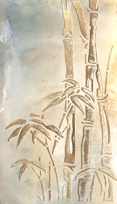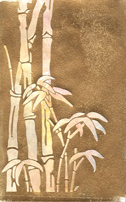 Love the Bamboo folder. I put some Kaleidacolor rainbow pad "Creole Spice" on a melt art mat, misted with water, and swirled my 65# white cardstock through it. Dried it. Brayered Versafine Toffee on the negative side of the folder, ran it through the Cuttlebug, then thermal embossed it with Queen's Gold. |