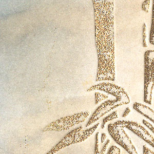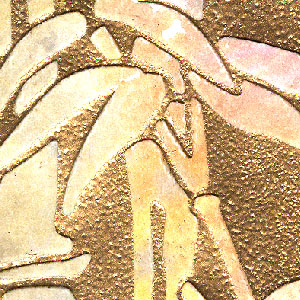 I put some Kaleidacolor rainbow pad "Creole Spice" on a melt art mat, misted with water, and swirled my 65# white cardstock through it. Dried it. Brayered Versafine Toffee on the positive side of the folder, ran it through the Cuttlebug, then thermal embossed it with Queen's Gold. |