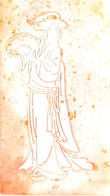 This is another one that was hard to scan. I used a Big & Juicy felt pad "Spice" 9only the orangey section), on the positive side of the folder. misted with water and ran 65#white cardstock through the Cuttlebug. Note: I cleaned off the face and hand of any stamp pad ink. The raised embossed image is quite white and has nice shadows from the orange ink. |