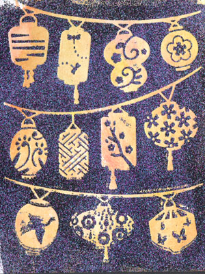 below. I also did this on on 65# white cardstock and the horizontal bars cracked open, so did the one below with 110# cardstock and that worked better. I put Distress Mustard Seed, Worn Lipstick & Dried Marigold on a melt art mat, misted with water, swirled the cardstock through it, then dried it. I pounced with Versafine Majestic Blue & brayered with Imperial Purple on the positive side of the folder, ran it through the Cuttlebug, and thermal embossed with clear. One I found the lanterns too glaring and the background color too washed out. |