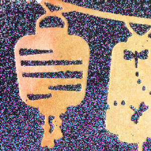 I put Distress Scattered Straw, Mustard Seed, and a touch of Worn Lipstick on a melt art mat, misted with water, swirled the 110# white cardstock through it, then dried it. I brayered the dirty folder with the Imperial Purple on the positive side of the folder, ran it through the Cuttlebug, and thermal embossed with Old Island Twilight. Now the lanterns have more of a glow and the background is more like a night sky. |